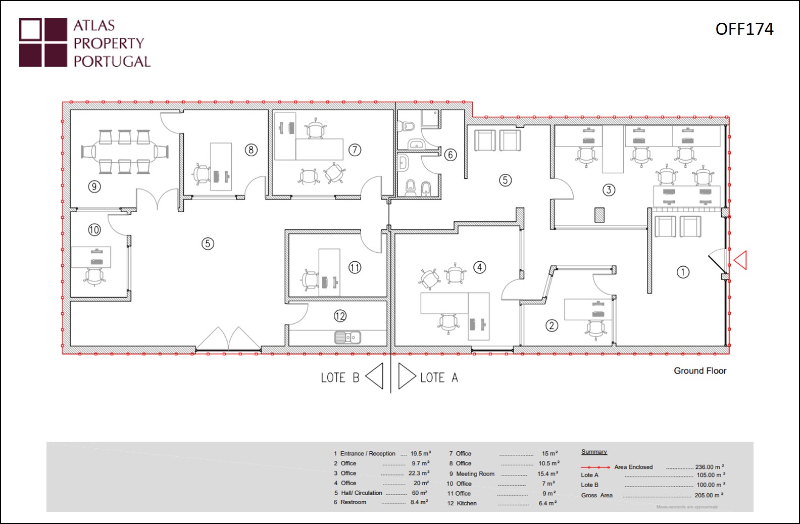 Duas grandes áreas comerciais adjacentes num prédio. A localização é numa zona residencial nobre perto de escolas, habitação, conservatório de música, museu apenas a 5 minutos do centro do movimentado mercado da cidade de Caldas da Rainha. O escritório ‘A’ tem 105m2 e é composto por escritórios / sala de reuniões, casas de banho e receção; O escritório ‘B’ tem 100m2 e é composto por cozinha, escritórios e sala de imprensa. Ambos têm instalações que permitem A/C e alarme e amplo estacionamento.